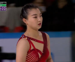 なんかスピンが最初に表示されていたより、かなり下げられてしまいました。ちゃんと全てレベル4だと思うけど、何が悪かったのか謎。足替えコンビネーションスピンはシットポジション2回とも認められなかったってことなんですかね。