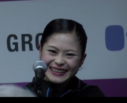 E: [英語]今日は良い演技でした。でも、もっといい演技ができます(微笑)。[場内から笑い声]解釈やスピンはもっとうまくできると思います。スピンはもっとスピードを上げ速く回りたいです。(小声で通訳に)緊張しちゃう…。